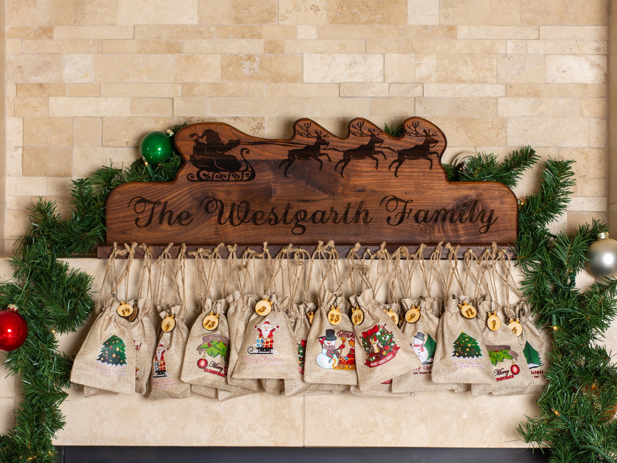 Personalized Mantel Advent Calendar - 24 Numbered Burlap Bags, Filled or Unfilled - 3 Holiday Designs, 4 Wood Options